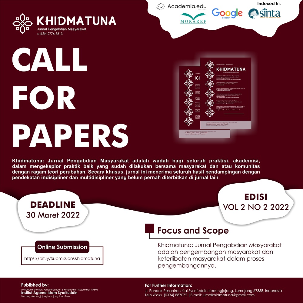KHIDMATUNA: Jurnal Pengabdian Masyarakat, Universitas Islam Syarifuddin Lumajang invites you to participate by submitting your academic papers on our Open Journal System website. (Klik Submit)